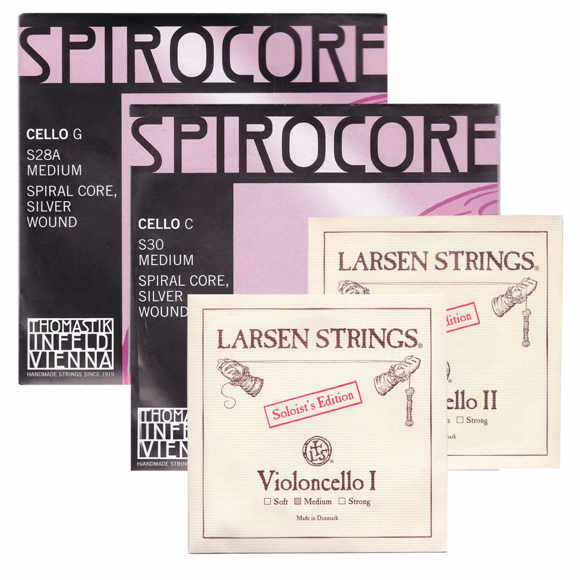 In addition to full sets of either Spirocore or Larsen Solo strings, another popular option among cellists is to mix the C and G strings of Spirocore with the D and A strings of Larsen Solo. This combination is known to provide a warm, yet powerful, tone for the upper strings while maintaining the clarity and projection of the Spirocore lower strings.